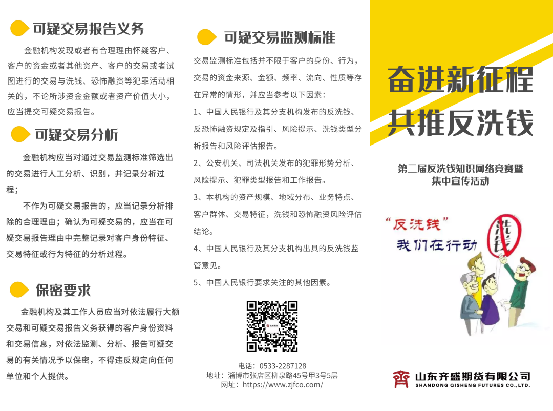 活動(dòng)期間,集團(tuán)公司法務(wù)風(fēng)控部聯(lián)合齊盛期貨公司積極投入到此次“奮進(jìn)新征程 共推反洗錢”活動(dòng)工作中,通過印制宣傳折頁、擺置宣傳海報(bào)、全員答題、制作反洗錢微視頻等方式,增強(qiáng)反洗錢活動(dòng)宣傳力度和覆蓋范圍。
